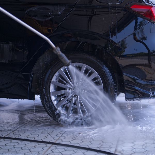 Spray a wheel cleaner onto the rims, allowing it to sit for 2 - 4 minutes to break down grime.