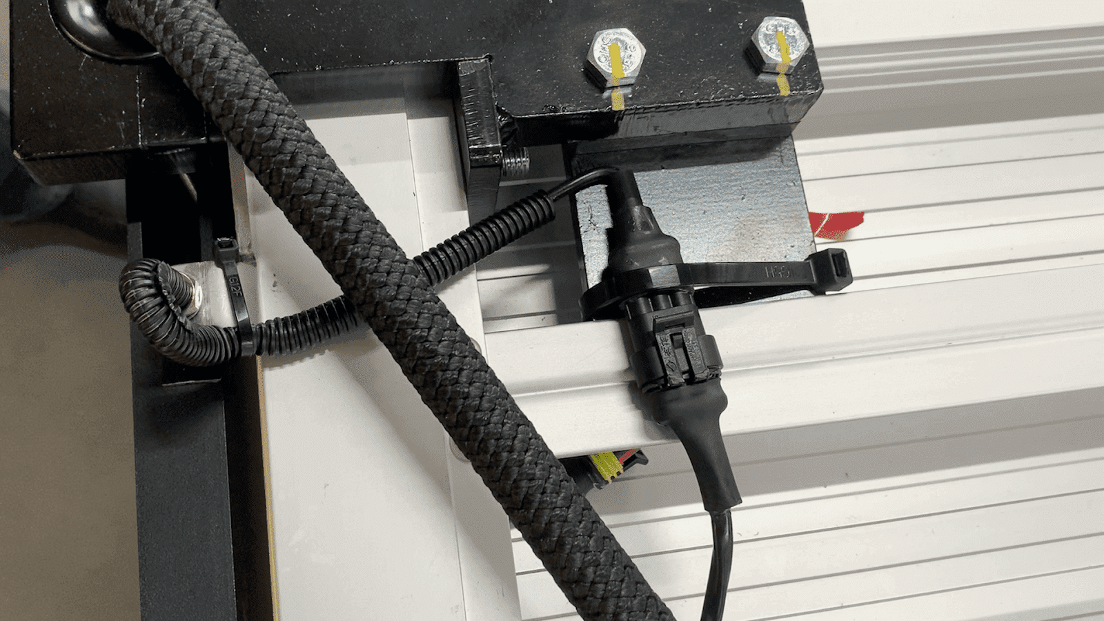 Position the corrugated split sleeve tubing around the sensor wiring and fasten with zip ties as pictured on the right, below.